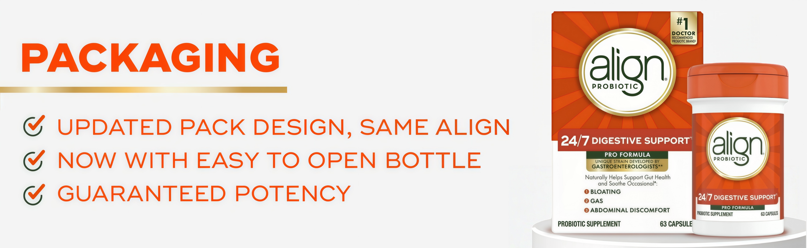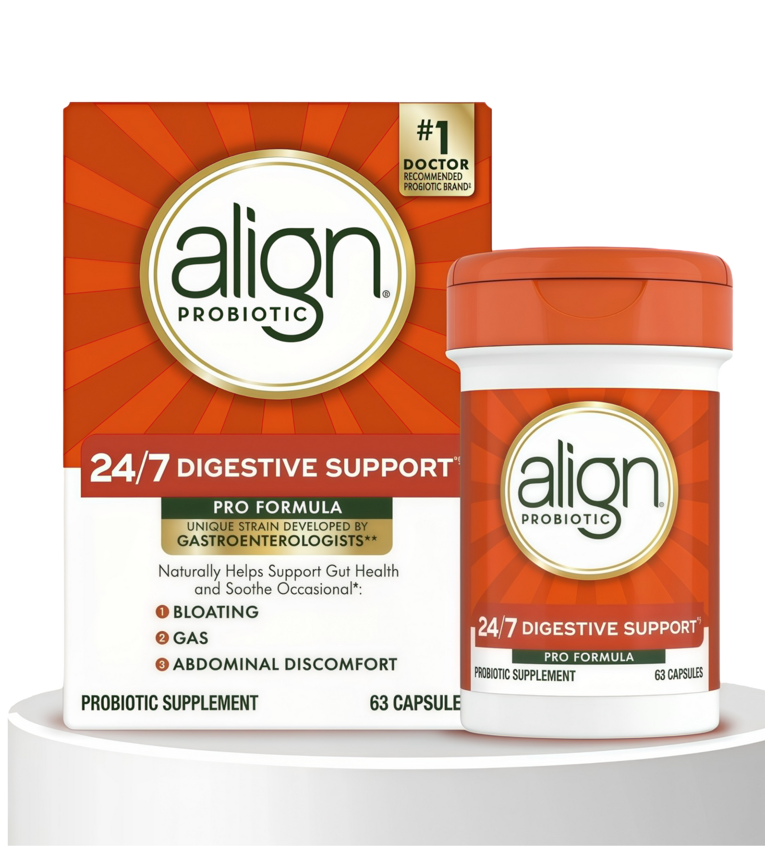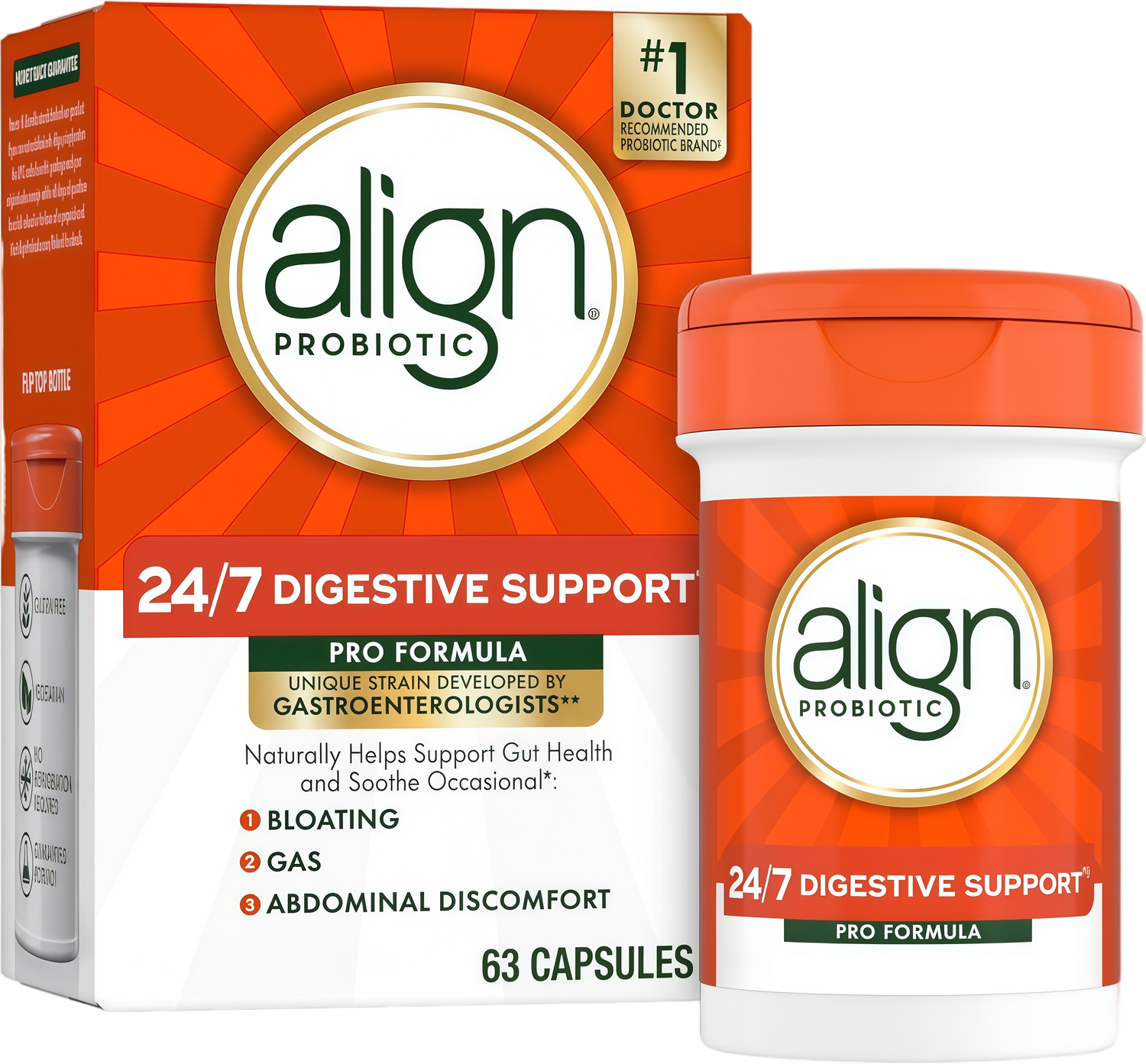 Recommended by Gastroenterologists two times more than any other probiotic brand, Align is the #1 doctor and gastroenterologist recommended probiotic brand. Align 24/7 Digestive Support + contains the unique probiotic strain Bifidobacterium 35624 which was developed by Gastroenterologists and backed by 20+ years of research. The probiotic strain in Align 24/7 Digestive Support + naturally helps soothe occasional bloating, gas, and abdominal discomfort. Align 24/7 Digestive Support + is vegetarian, gluten-free, and does not require refrigeration.
